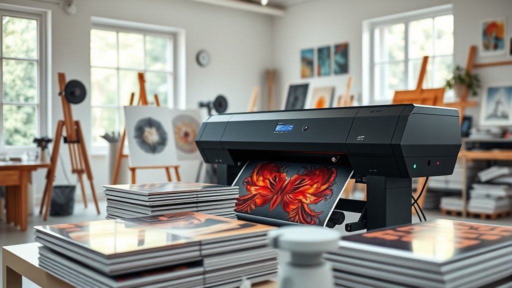 If you’re looking for the top professional fine art printers for your studio in 2025, I recommend focusing on high-quality devices like the Canon PIXMA PRO-200S, which offers vibrant, detailed, large-format prints. Pair it with premium media such as waterproof polyester canvases and textured watercolor papers for artistic versatility. Portable options like the Silhouette Mint and OZER M08Pro are perfect for mobile projects. Keep in mind, choosing the right equipment depends on your workflow and budget—discover more to make the best choice.