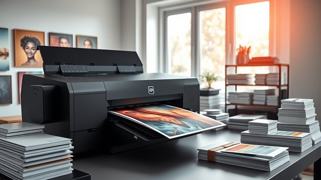 Choosing the right fine art printer is like selecting the perfect brush for your masterpiece—every detail matters. With options ranging from vibrant inkjet printers to premium canvas rolls, you can craft images that truly pop off the page. Remember, the right tools turn your vision into reality, transforming blank surfaces into vivid stories. So, pick wisely, and let your art shine brighter than ever before. Your masterpiece awaits—ready to come alive.