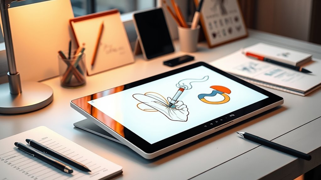 Like a knight’s armor, safety features protect creatives. I always look for displays with anti-glare screens to reduce eye strain, sturdy build quality, and secure pen holders to prevent accidental drops. Also, overheat protection and ergonomic design matter, ensuring comfort and safety during long hours. Think of it as having a trusty steed—reliable, safe, and ready to support your artistic journey without worry.