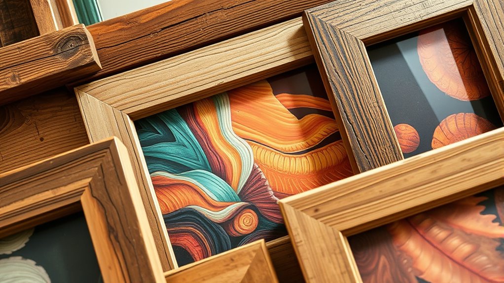 Think of reclaimed barn wood like a seasoned knight—battle-hardened and resilient. I find that these frames are surprisingly durable, often outlasting new wood because they’ve adapted to the elements over time. While they may show some character marks, their sturdy construction makes them a reliable choice for framing art. I trust reclaimed wood not just for its charm, but because it’s built to stand the test of time.