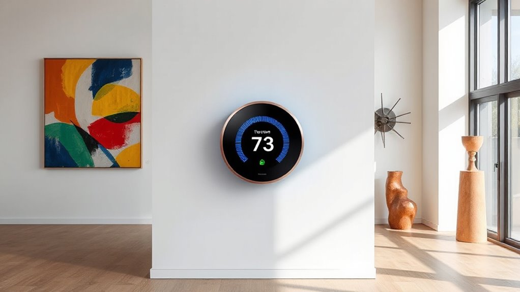 If you’re looking for the 15 best smart thermostats for studios and galleries in 2026, I’ve got you covered. These models support most HVAC types, are easy to install, and integrate seamlessly with popular smart home systems like Alexa, Google Assistant, and Apple Home. They offer sleek designs, intuitive controls, and energy-saving features that help reduce costs while maintaining perfect comfort. Keep going to discover detailed options perfect for artistic and modern spaces.