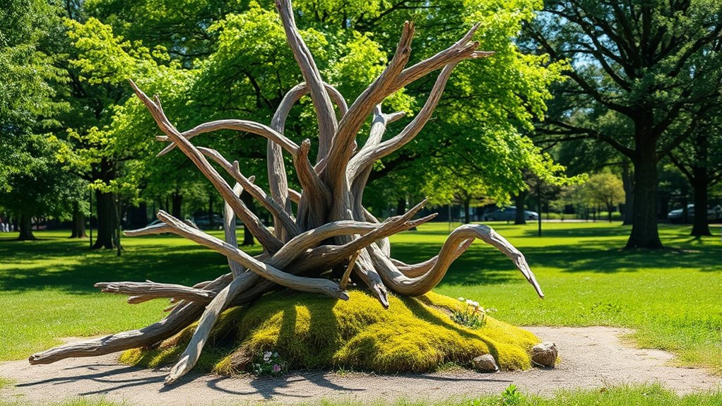 Sustainable outdoor sculptures are like living art that needs gentle care. I regularly inspect them for weather damage, clean off dirt with eco-friendly solutions, and apply protective coatings when needed. Since they’re built to last, maintenance isn’t overwhelming, but staying vigilant guarantees they remain vibrant and eco-friendly. Think of it as tending a garden—consistent care keeps these sculptures inspiring and resilient for years to come.