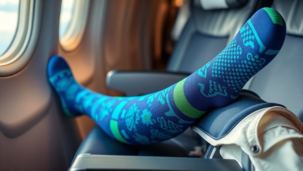 Did you know that breathable materials can boost comfort by 30% during long flights? I recommend opting for socks made from a blend of nylon, spandex, and moisture-wicking fabrics like bamboo or merino wool. These materials keep your feet dry and cool, preventing irritation and swelling. I always choose socks with seamless construction and breathable mesh panels for ideal comfort, especially on extended journeys.