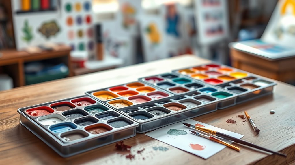 Portability is a crucial factor for artists who enjoy painting outdoors or need to carry their supplies frequently. Compact, lightweight watercolor sets with built-in compartments or cases make it easier to transport everything without hassle. Removable or modular palettes let me customize my color selection and reduce weight, which is essential when on the move. Durable, sturdy cases with secure closures prevent spills and protect my supplies during transit, keeping everything organized. Some sets feature integrated mixing trays or dual-purpose lids, saving space and enabling quick color blending in tight spots. Many portable kits also include compact brushes and accessories, allowing me to carry all necessary tools in a single, manageable package. This combination of thoughtful design and practicality makes outdoor painting more accessible and enjoyable.