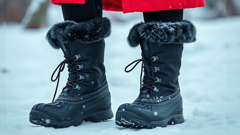 Finding the right fit and ensuring comfort are essential when selecting waterproof snow boots for women, especially since you’ll be wearing them for extended periods in cold conditions. A proper fit keeps your feet secure without feeling tight, preventing blisters and discomfort. Cushioned insoles and padded collars add extra comfort, helping reduce fatigue on long snowy days. Adjustable closures like laces or straps let you customize the fit, accommodating different foot shapes and sock thicknesses. It’s important to have a snug fit that still leaves room for thick winter socks, so your feet stay warm without restricting circulation. Breathable linings are also key—they prevent sweat buildup and keep your feet dry and comfortable during extended outdoor activities.