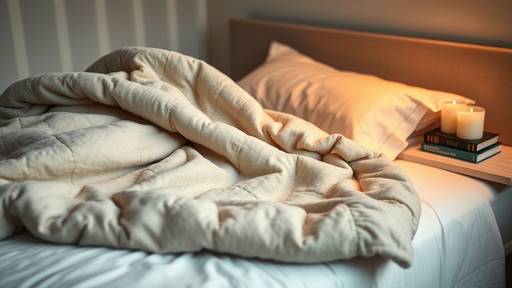 Ever wondered how the right size and fit of a weighted blanket can influence your anxiety relief? The key is finding a blanket that covers your entire body comfortably without hanging over the edges of your bed. Ideally, it should be about the same size as your mattress or slightly smaller to prevent slipping. If you sleep on your side, a slightly larger blanket can offer better coverage without bunching. It’s also important that the weight matches your body size—typically 7-12% of your weight—to provide gentle, consistent pressure without discomfort. A well-fitting blanket stays in place during movement, offering ongoing calming pressure that helps reduce anxiety. Proper size and fit are essential for maximizing the soothing effects of your weighted blanket.
