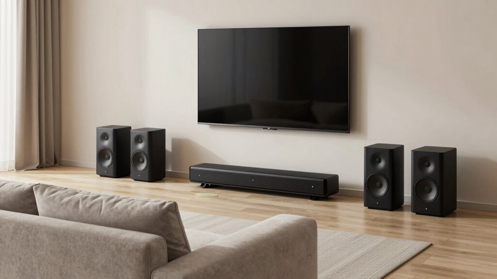 Choosing a premium wireless surround sound system hinges on its sound quality standards, which guarantee an immersive and impactful audio experience. High-quality systems support lossless audio formats like Dolby Atmos, DTS:X, or FLAC, guaranteeing crystal-clear clarity and depth. A signal-to-noise ratio of at least 96 dB minimizes background noise, delivering pure sound. Deep bass response down to 20-35Hz enhances low-frequency effects, creating a realistic cinematic feel. Precise surround imaging requires multiple channels—such as 5.1.2 or 7.1.4—and balanced speaker placement for accurate spatial sound. Additionally, low distortion levels below 0.5% and peak power of 760W or more ensure your audio remains clear and powerful, even at high volumes. These standards are essential for a truly premium listening experience.